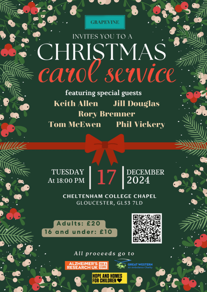 On Tuesday 17th December at 6pm, Grapevine will be holding their charity carol service at Cheltenham College Chapel in Gloucestershire. And this year this wonderful event will feature celebrity guest speakers including Rory Bremner, Phil Vickery, Jill Douglas, Dr. Dawn Harper and actor Keith Allen.
