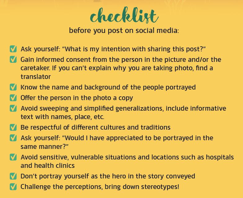 Why do you travel and volunteer? Is it for yourself or do you really want to make a difference? Your intentions might affect how you present your experiences and surroundings on social media, for instance by representing the context you are in as more “exotic” and foreign than it might be. Ask yourself why you are sharing what you are sharing. Are you the most relevant person in this setting? Good intentions, such as raising awareness of the issues you are seeing, or raising funds for the organization you are volunteering with, is no excuse to disregard people’s privacy or dignity.